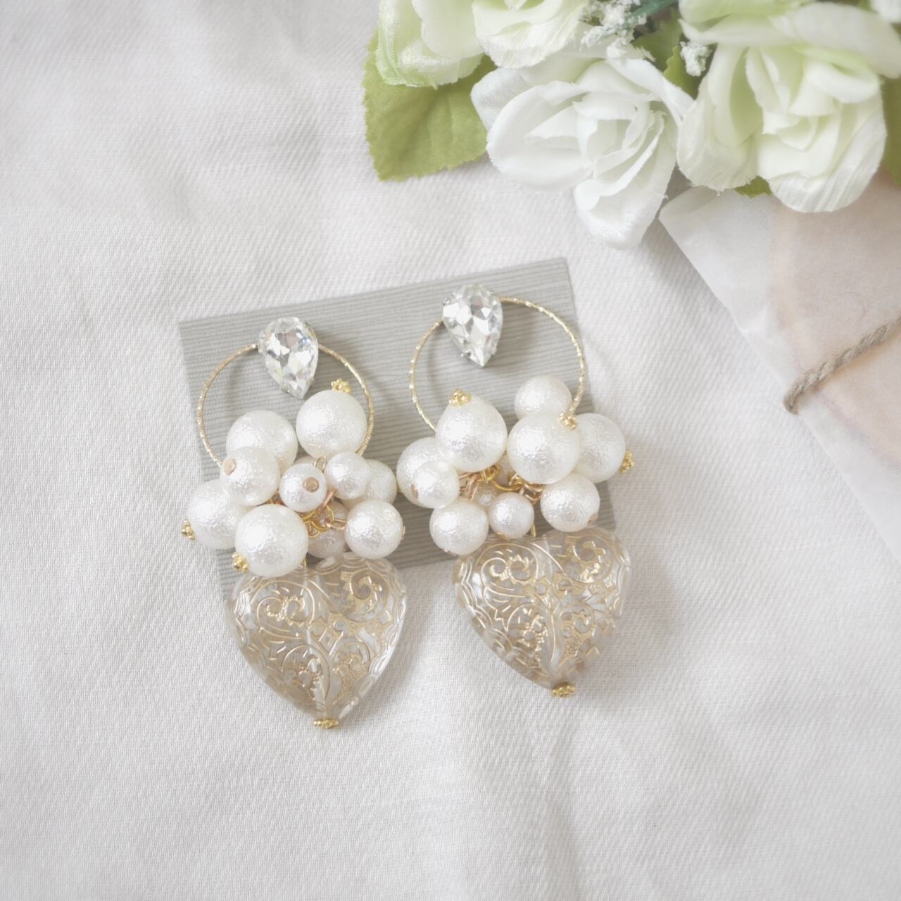 189.Clear heart & pearl ピアス✴イヤリング cocoangeゴールドホワイトパールビジューストーンクリアクリスタル透明結婚式お呼ばれお洒落揺れる上品大人 | COCO ANGE.
