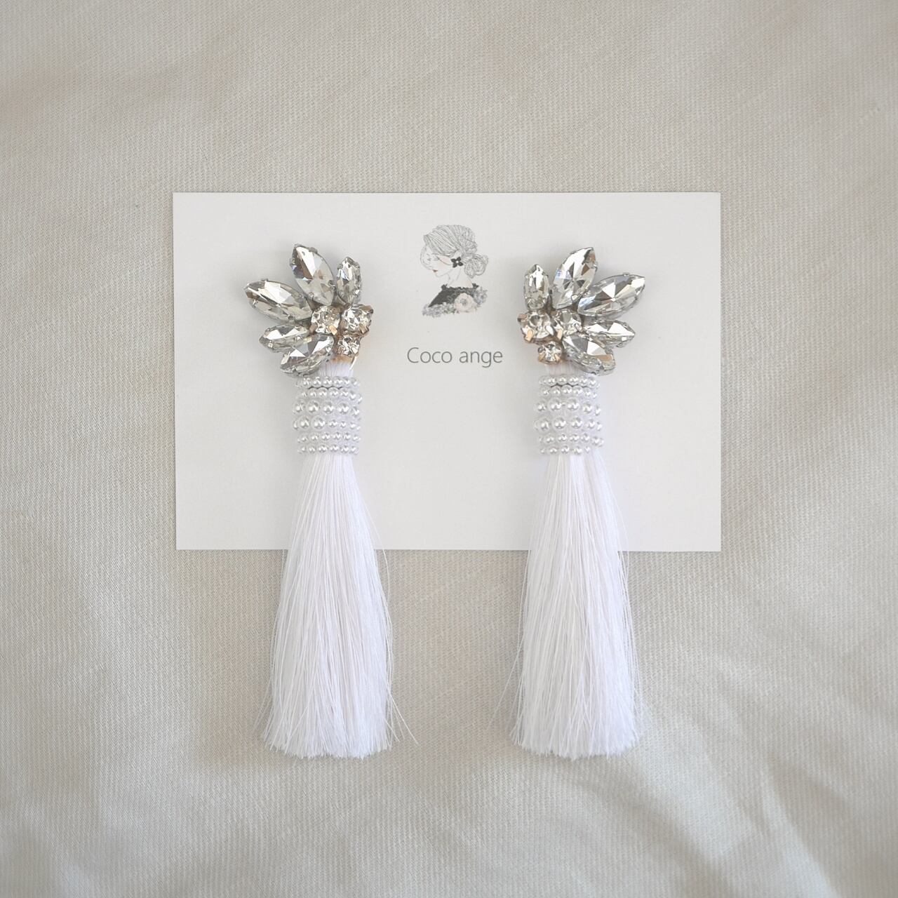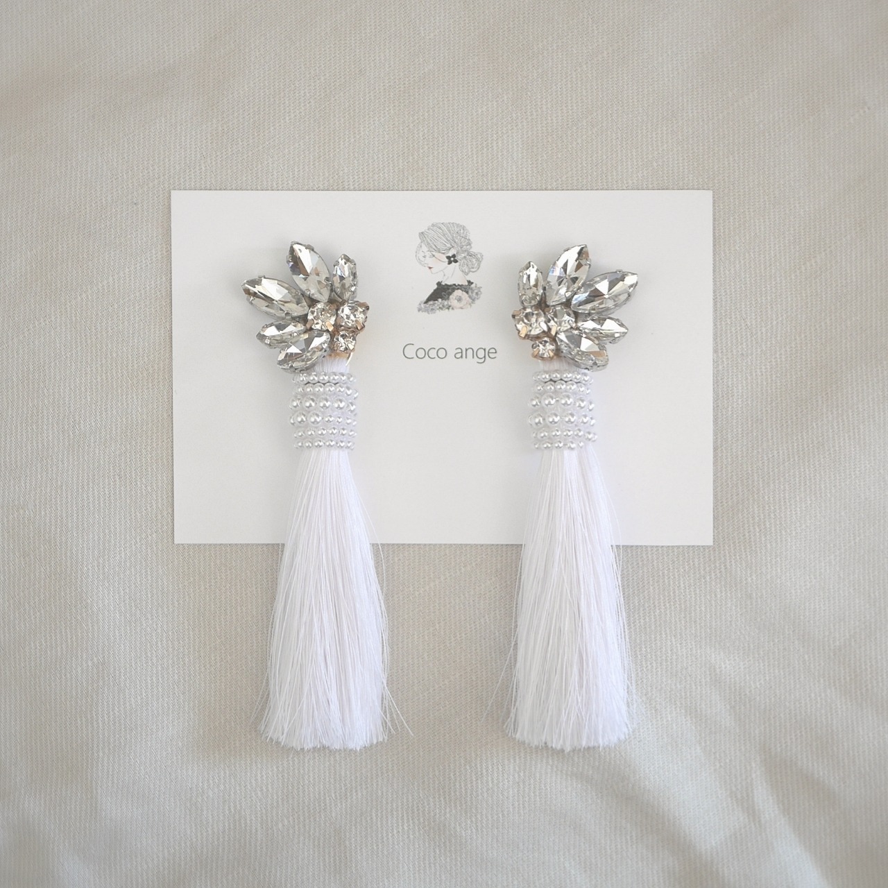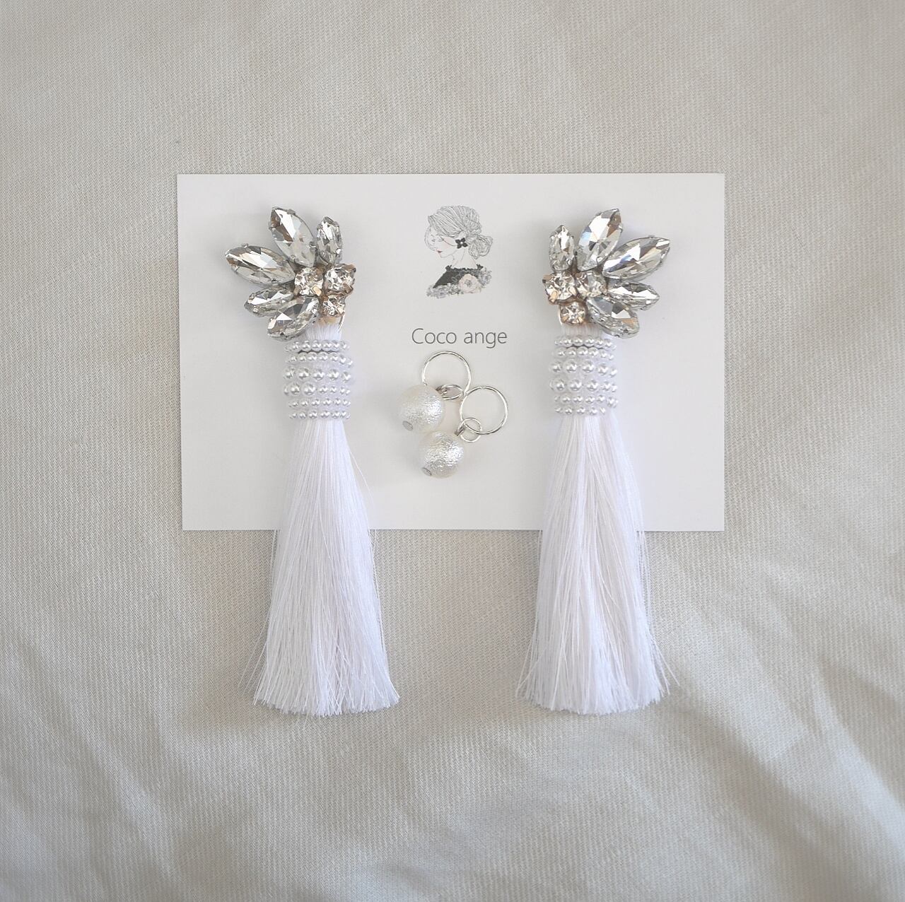 輝くリーフとホワイトタッセル large «3way»ピアス❈イヤリング203 COCO ANGE.結婚式ウェディングウエディングブライダルパーティー花嫁大振り大ぶり白パールビジューキラキラ豪華葉っぱボタニカルお洒落 | COCO ANGE.