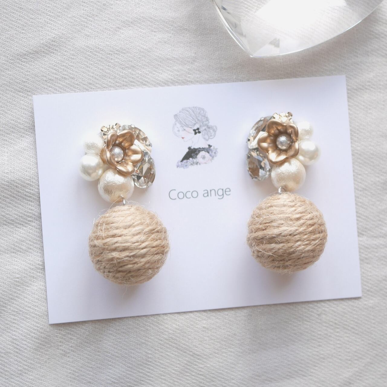 お花とボンボンリネン gold «2way»ピアス❈イヤリング211 COCO ANGE.フラワー大振り大ぶり麻春夏ラタンボール丸コットンパールおすすめ可愛い揺れるボタニカル自然植物カジュアルゴールドベージュホワイト | COCO ANGE.