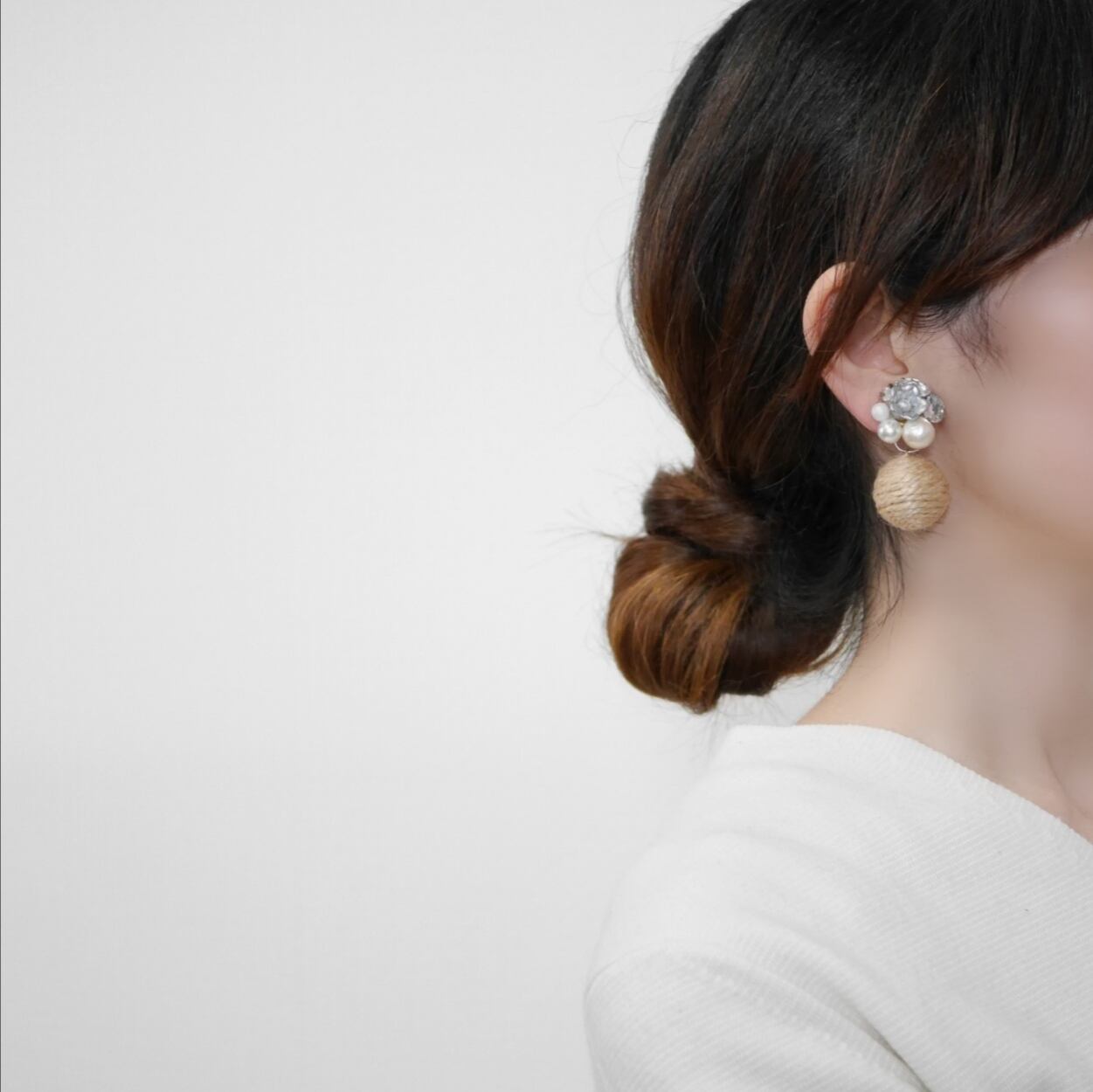 お花とボンボンリネン silver «2way»ピアス❈イヤリング212 COCO ANGE.大振り大ぶり麻春夏ラタンボール丸涼し気コットンパールおすすめ可愛い揺れるフラワーボタニカル自然植物シルバーベージュホワイト | COCO ANGE.