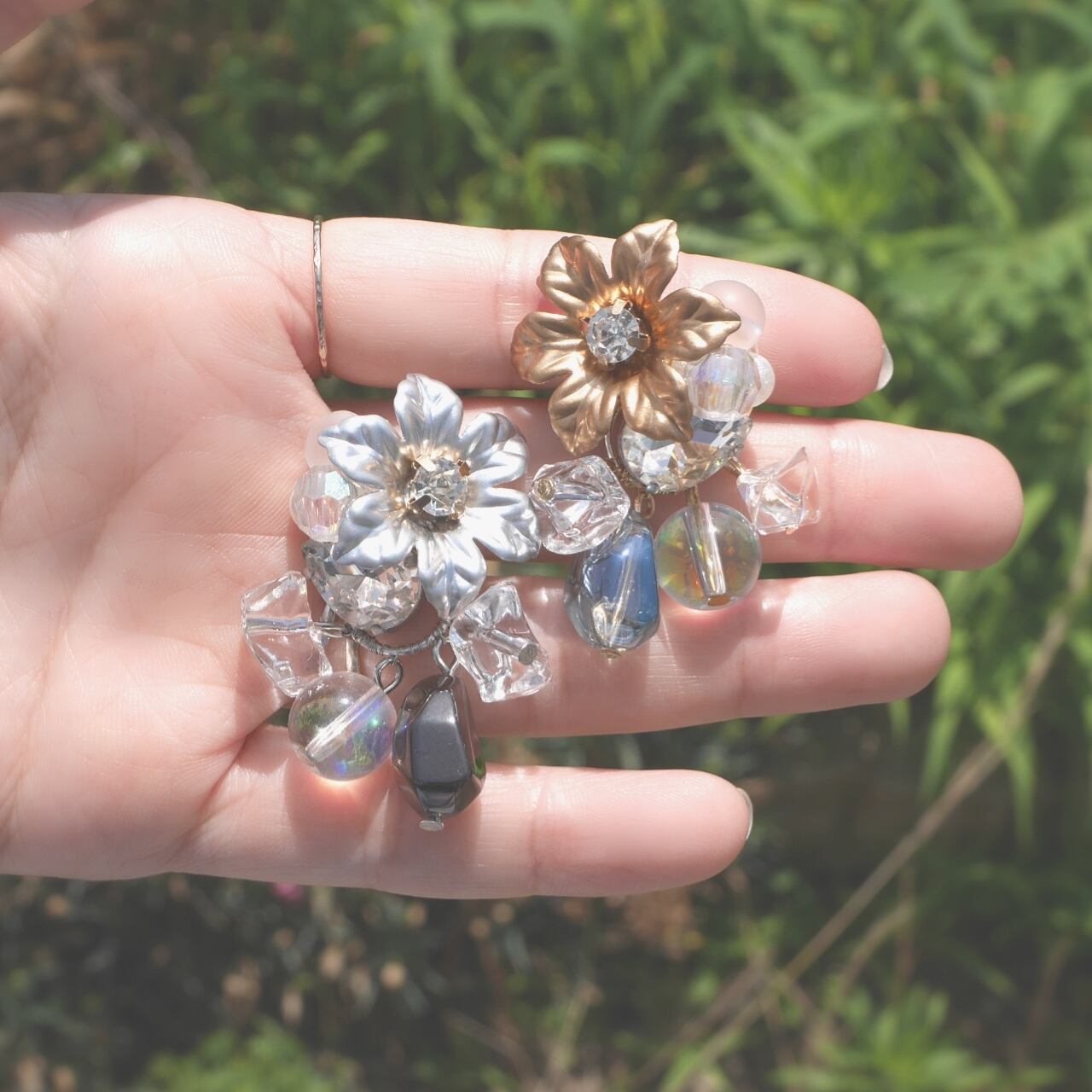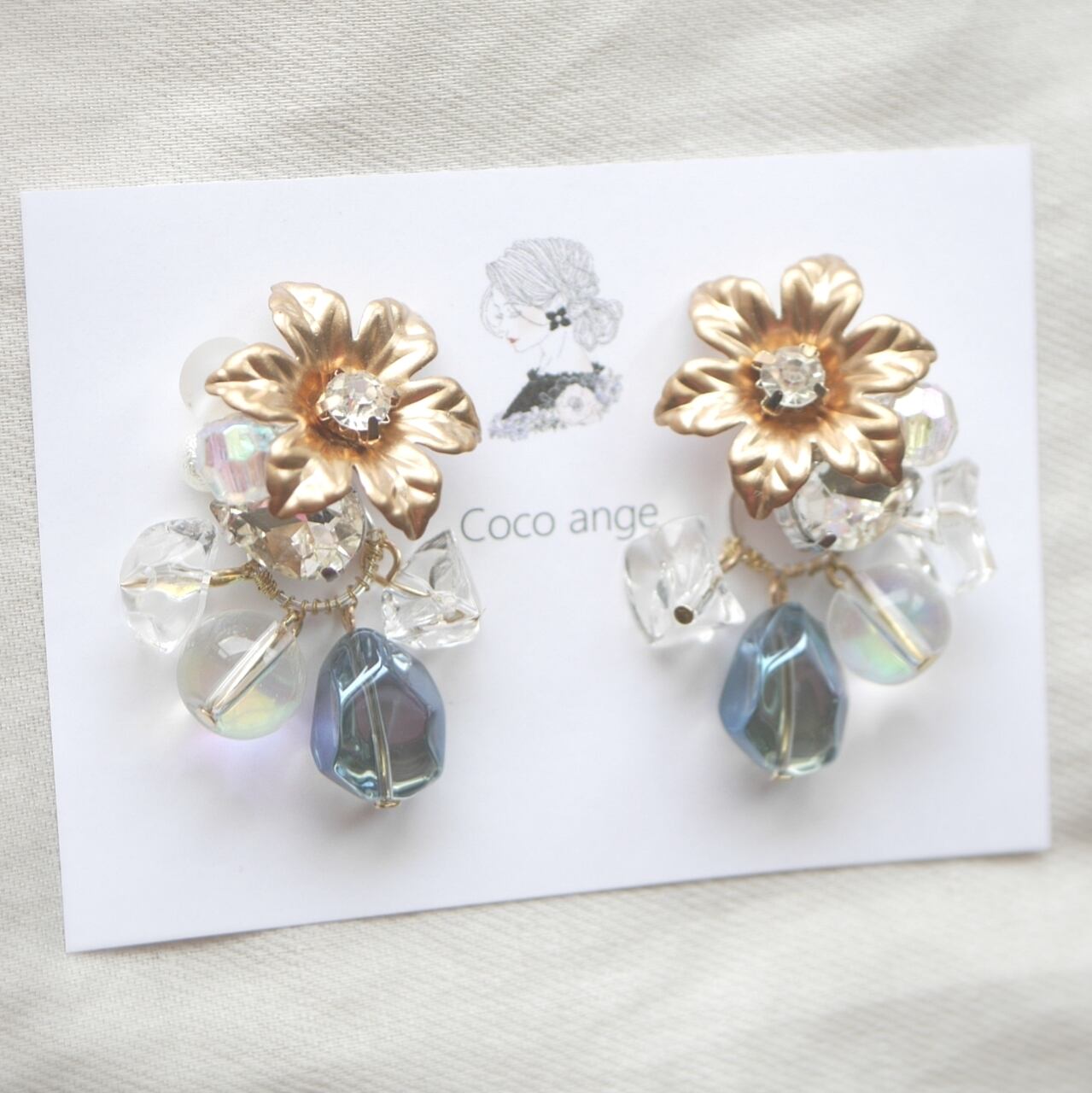 夢と虹色とフラワーと gold «2way»ピアス❈イヤリング213 COCO ANGE.大振り大ぶりクリアクリスタルアイス氷透明感虹色オーロラストーフラワーお花春夏カジュアルゴールドブルー青水色結婚式パーティー可愛い | COCO ANGE.
