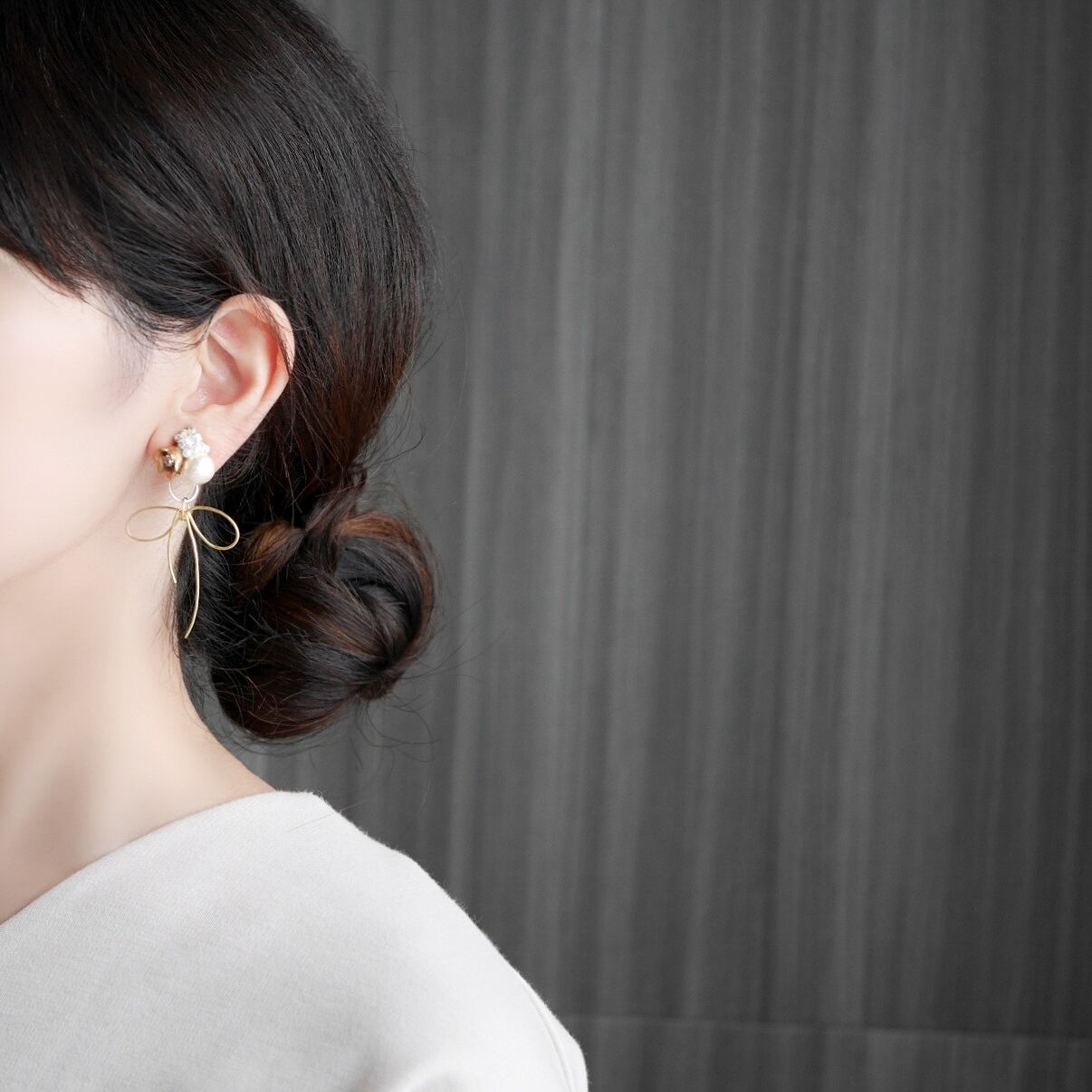 リボンに一目惚れ «2way»ピアス❈イヤリング230 COCO ANGE.結婚式ウェディングウエディングブライダルパーティーお呼ばれオケージョンシンプルカジュアル華奢繊細ゴールドワイヤーコットンパールフラワーお花上品 | COCO ANGE.